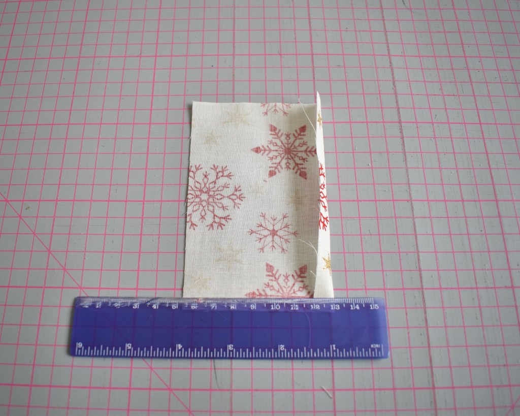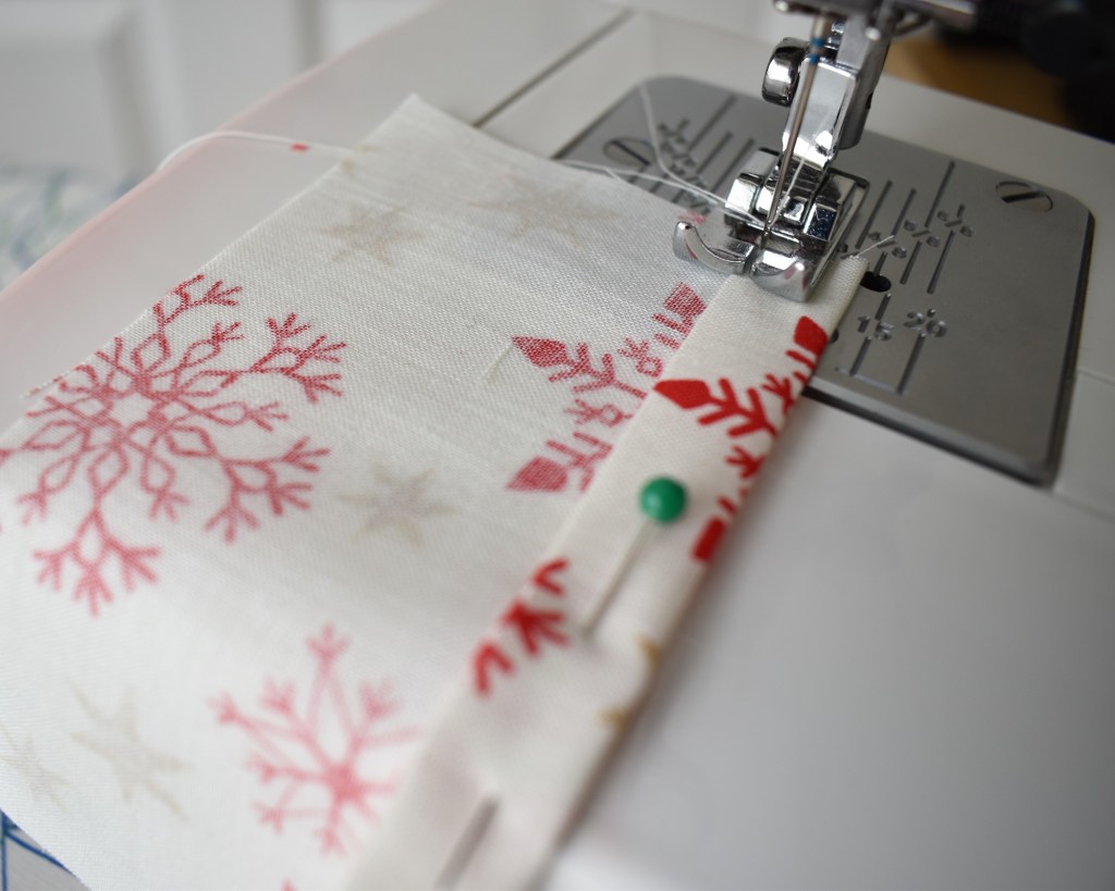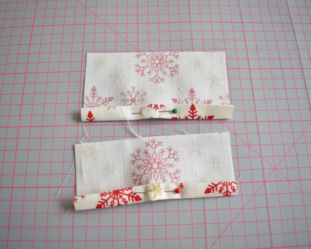 Take the two smaller pieces of fabric and fold a 1 cm hem along the long edge of each fabric. Fold it a second time to make a double folded hem that won’t fray. Pin down.
