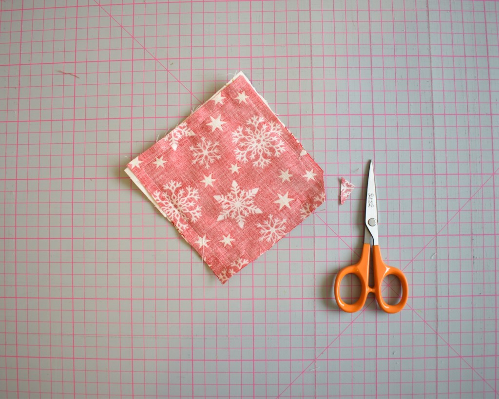 Cut off the four corners, leaving a couple of millimeters between the cut and the stitch line. This helps the corners to be turned neatly with no bunching.